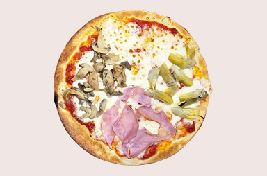 Pomodoro, mozzarella, funghi, carciofi, prosciutto cotto